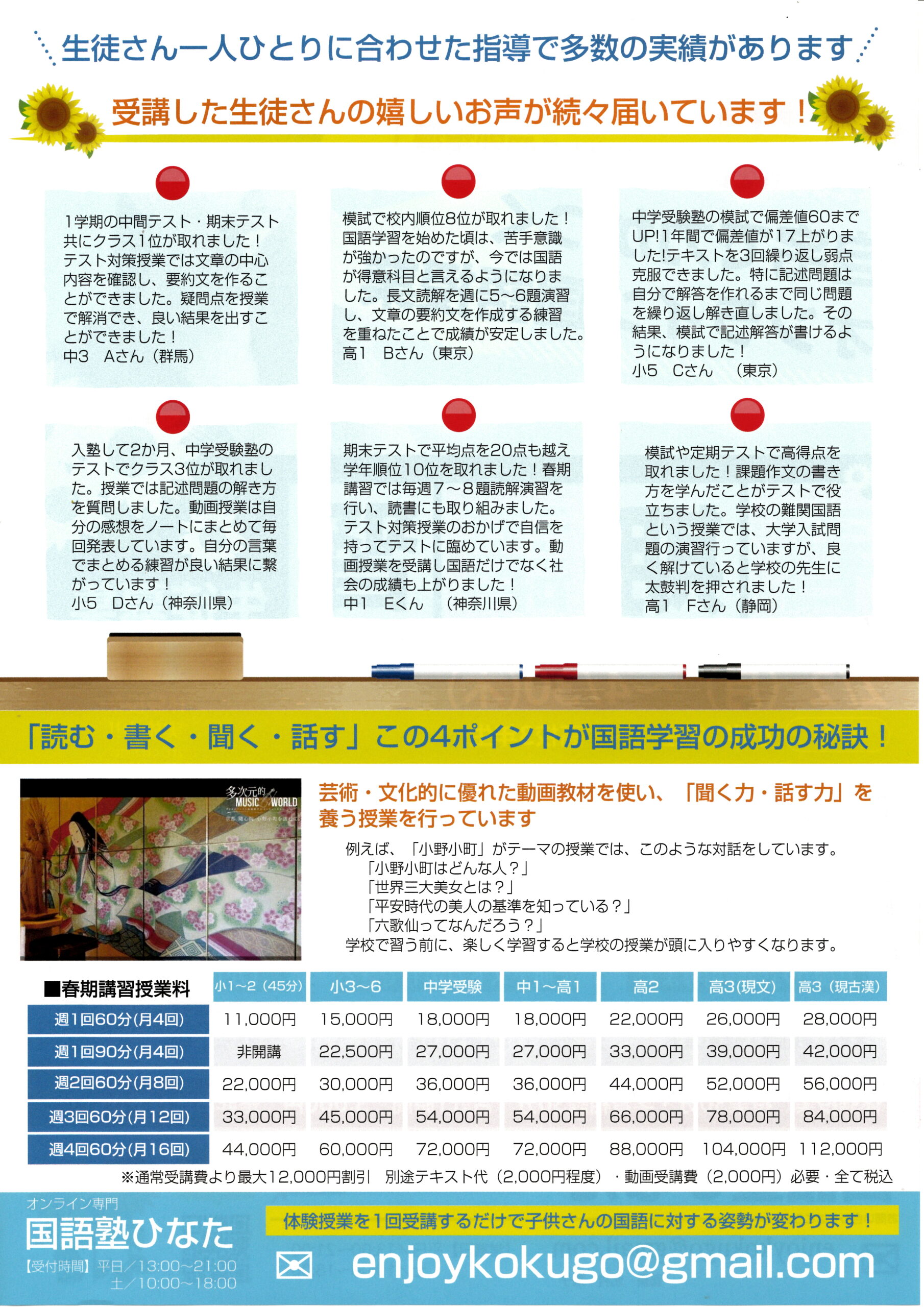 また、送迎などのご家庭の負担もありません。全国どこからでも、東京の国語塾の授業を受けられます!
